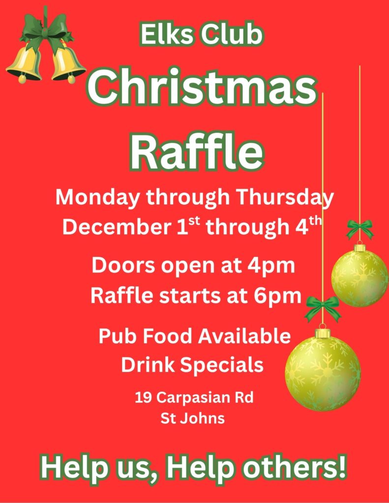 The St. John’s Elks Lodge 245 will hold it’s 60th Annual Elks Club Christmas Raffle December 1-4th. The raffle runs form 6-9 pm each night. Doors open at the club at 4 pm.